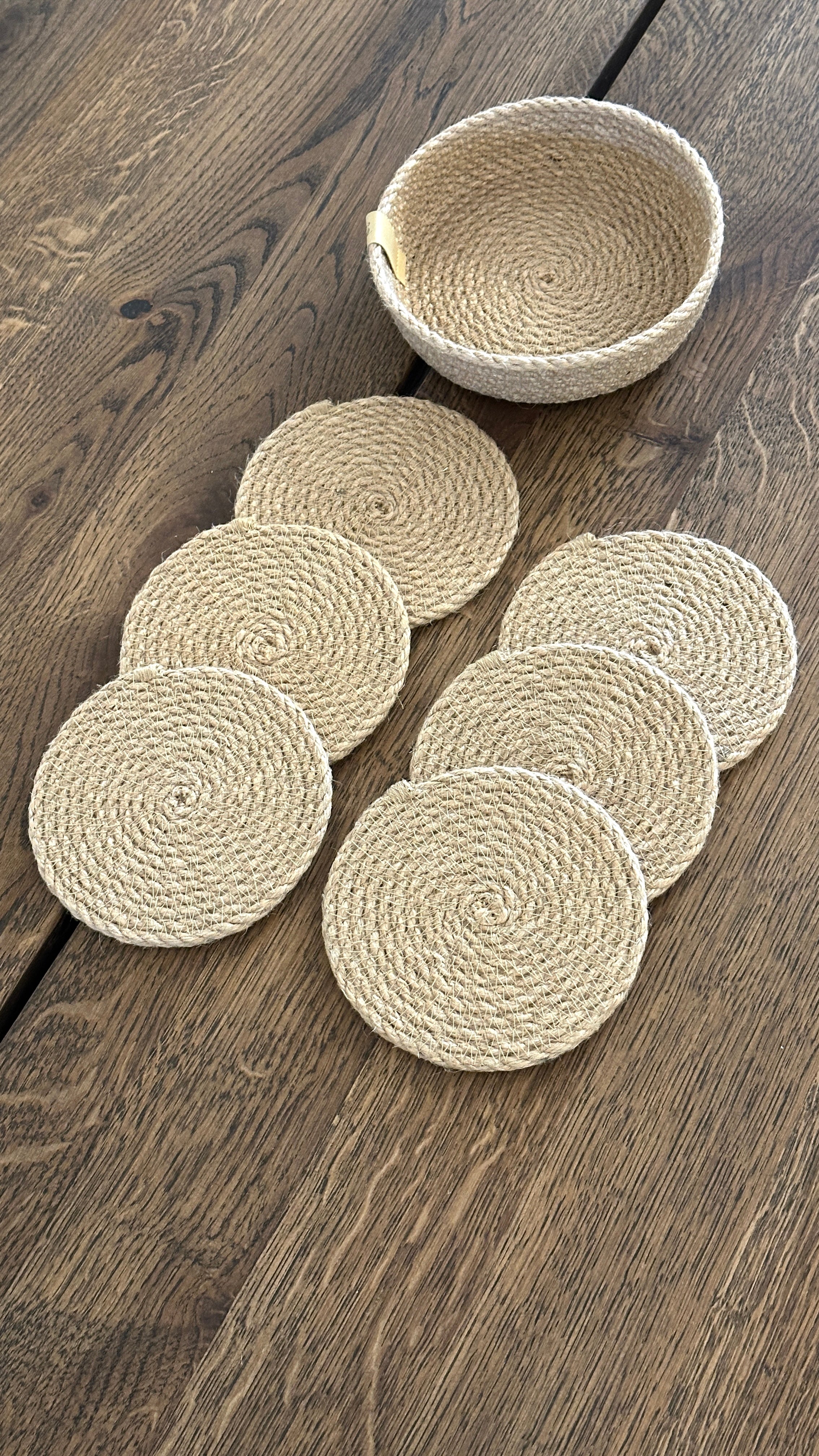Nyhed hos Elena Poulsen collection – et sæt med seks glasbrikker i en lille holder. Praktiske og smukke underlag, der beskytter bordet mod varme kopper og skaber hygge. Håndlavet i naturlig jute af premium kvalitet – en perfekt kombination af funktionalitet og æstetik.